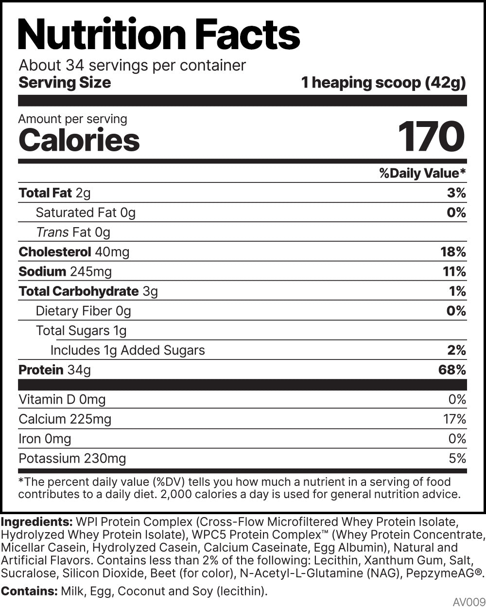 This elite protein powder features a unique blend of 7 forms of protein, including WPI Protein Complex (Cross-Flow Microfiltered Whey Protein Isolate and Hydrolyzed Whey Protein Isolate) and WPC5 Protein Complex™ (Whey Protein Concentrate, Hydrolyzed Casein, Potassium Caseinate, Micellar Casein, and Egg Albumin).