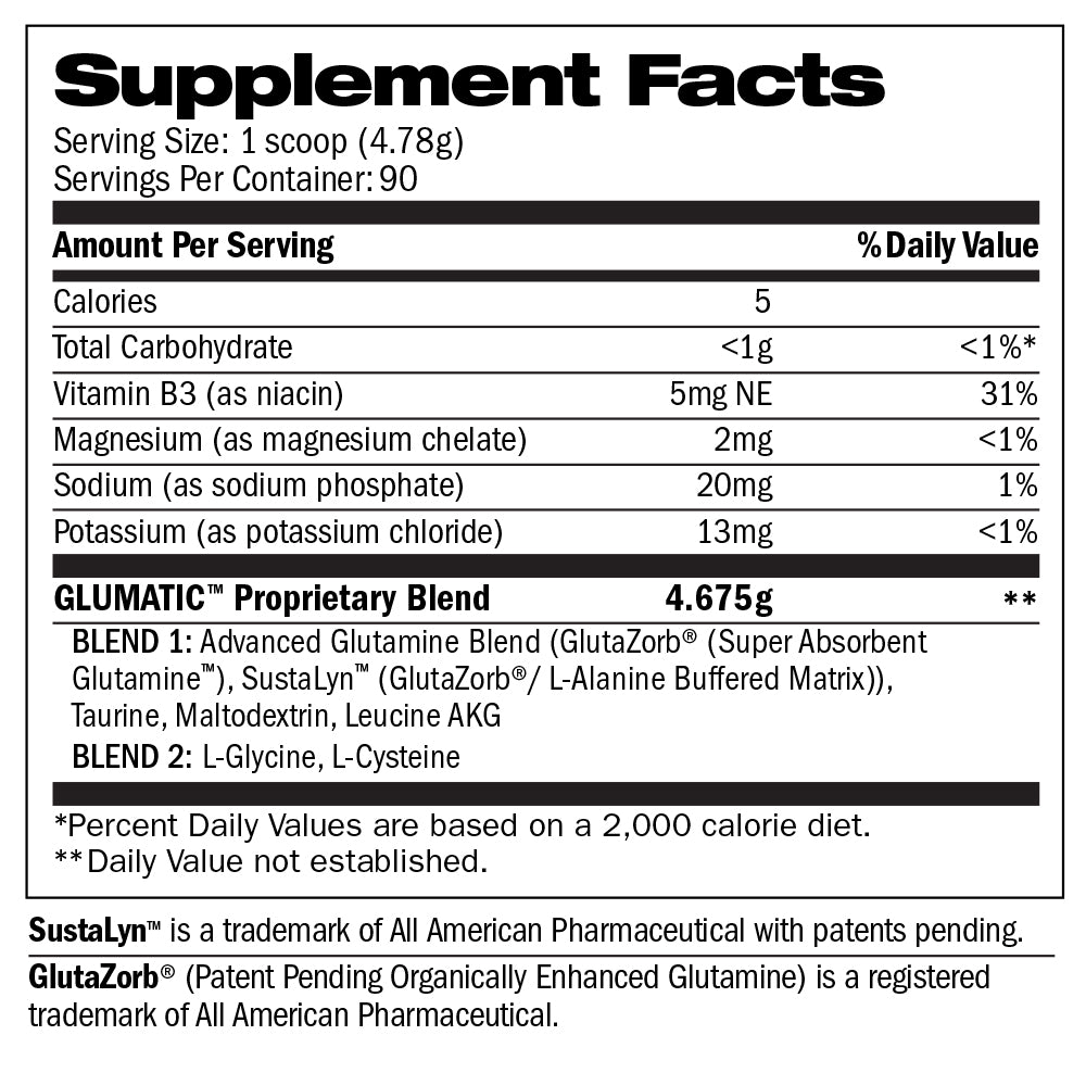 Developed with clinically-tested compounds, GLUMATIC™ by pH Labs® takes glutamine supplementation to even greater heights. GLUMATIC™ is an advanced glutamine-based supplement meticulously formulated with pH-Correct GlutaZorb®, SustaLyn™, and amino acids. With its extreme solubility, you can mix GLUMATIC™ with your favorite protein, BCAA, pre-workout or post-workout supplement. For those looking for a high-quality glutamine supplement, your search is over with GLUMATIC™.