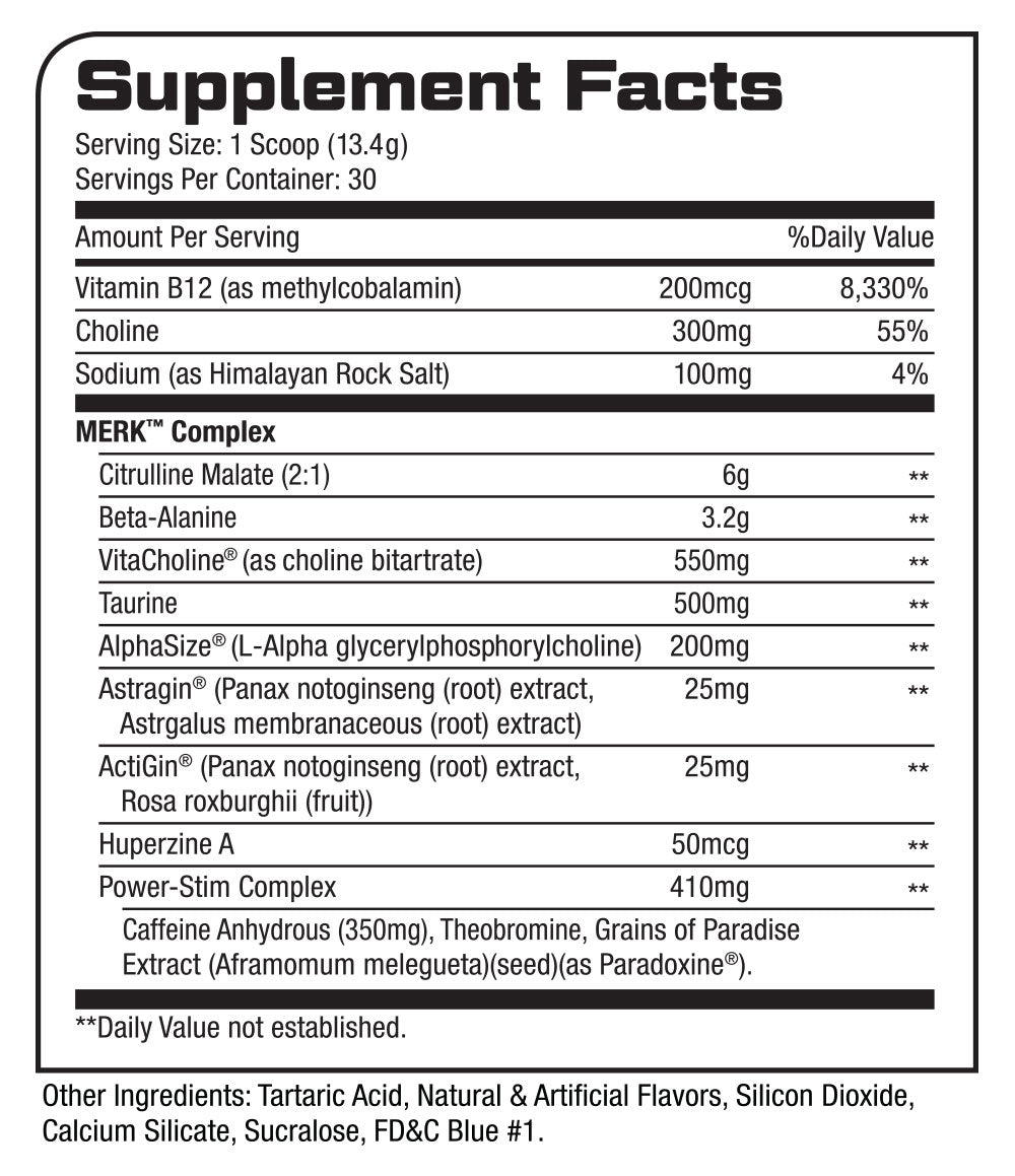 The game-changing ingredient roster that makes up MERK’s advanced formula includes 6g of Citrulline Malate, 3.2g of Beta-Alanine, 550mg of VitaCholine®, 350mg of Caffeine, and 200 mg of AlphaSize® (L-Alpha glycerylphosporylcholine). The Stance Supplements formulators didn’t stop there, though. They also included complementary ingredients like vitamin B12, Himalayan Rock Salt, Choline, ActiGin® and Astragin®. Trust us when we say, this potent performance optimizer is packed to the max with in-demand pre-workout ingredients, setting it up to revolutionize the pre-workout category!