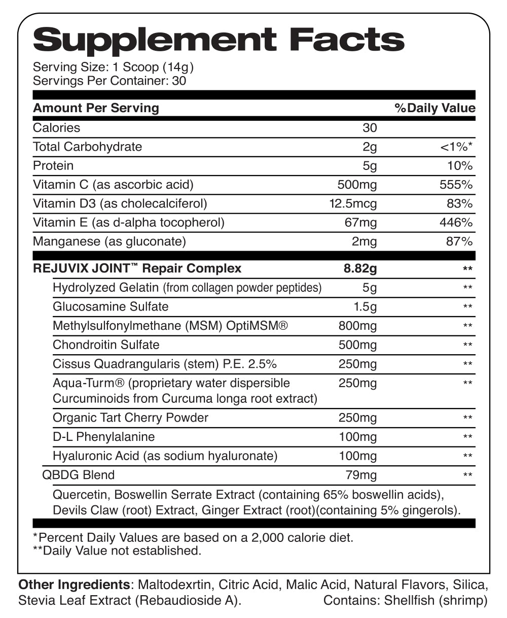 REJUVIX JOINT™ boasts a high-potency, high-milligram serving that comes in a refreshingly light citrus flavor. Shake up one scoop with 8 to 10 ounces of ice-cold water any time of day and start reaping the benefits that these ingredients can give. It’s time to think about your joints. It’s time for REJUVIX JOINT™.