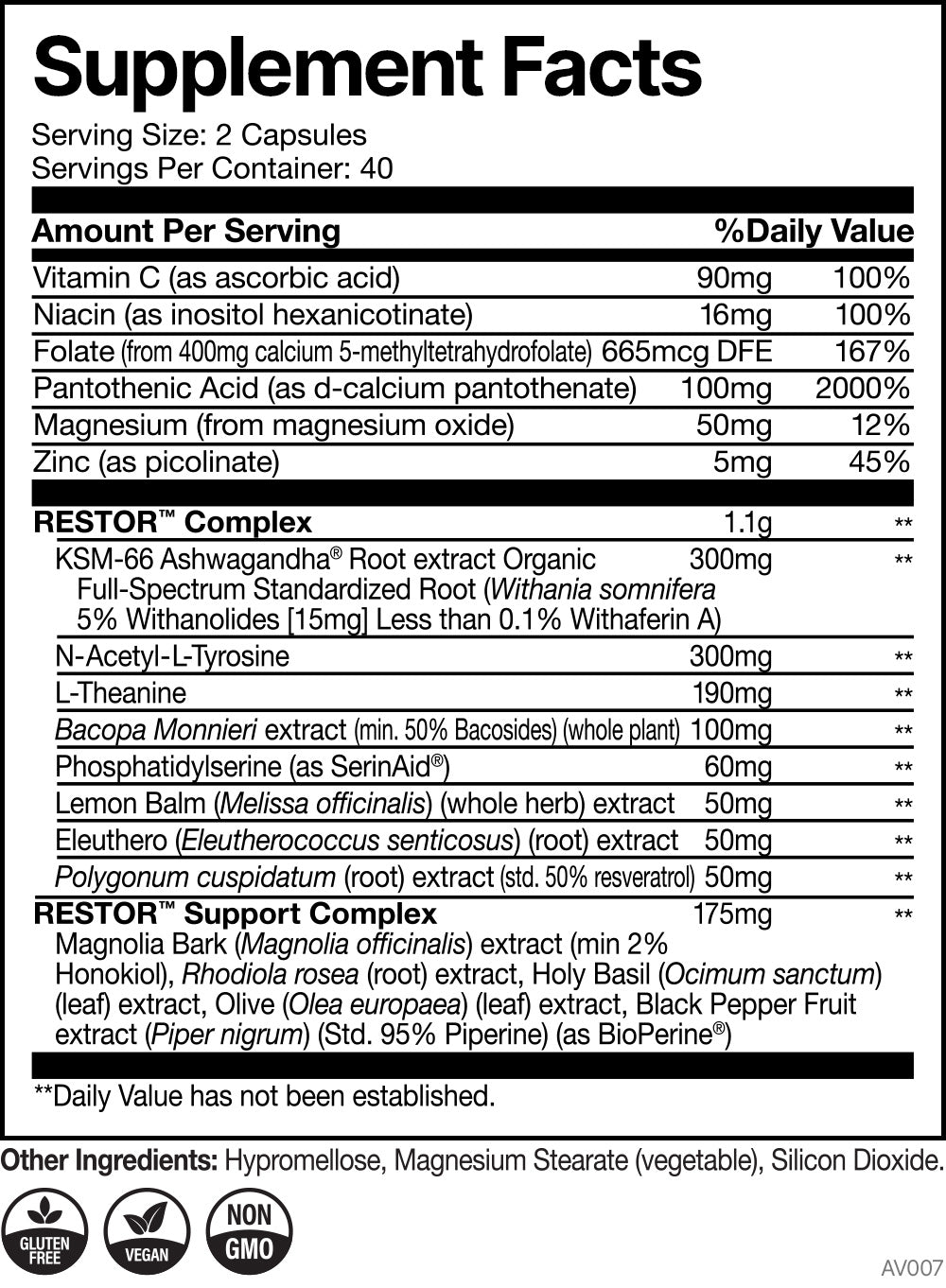 The botanicals Bacopa Monnieri, Lemon Balm extract, and Eleuthero extract along with L-Theanine and the patented ingredient SerinAid® Phosphatidylserine were also included to round out this innovative stress-support product. Don’t let occasional stress get the better of you. Try RESTŌR today and be ready for whatever your day may bring!